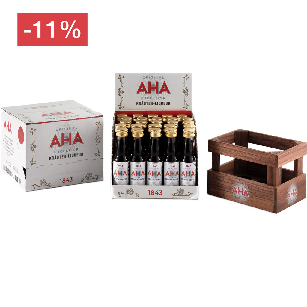Drinnen: 2 × 25 Mini-Flaschen AHA Excelsior (0,02 l) – perfekt zum Anstoßen, Weiterreichen und „Noch eine Runde!“ rufen.