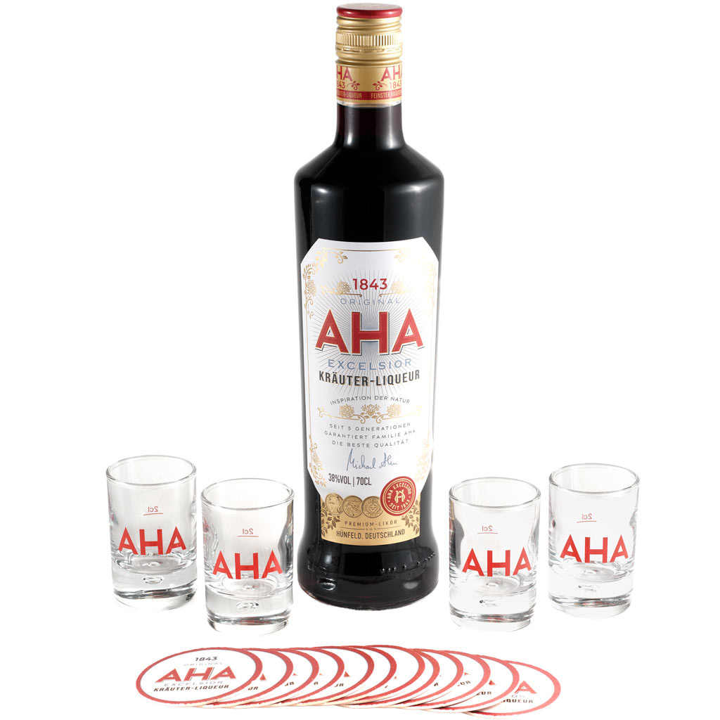 wurde in den Warenkorb gelegtInhalt: 1 × 0,7 l AHA Excelsior Kräuterlikör, 4 × Party-Stamperl „Bubble“, 12 × Deckelchen für Spiel & Spaß